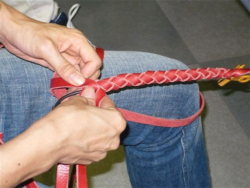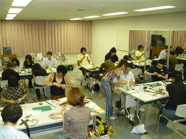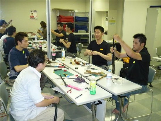 2008年09月10日 ★☆第1回 ムチ作りワークショップ☆★ 8月31日に行なわれた 日本鞭競技協会の第1回ムチ作りワークショップの報告です☆ 13時30分スタートで南スポーツセンターへ集まり、 参加する会員さんは17名でした。 指導をしてくれる加藤さんと林さん、サポートでかけつけてくださった代表の小林さんと 早めについた会員さんとでテーブルや椅子、材料の準備などを行い、 開始は受付から名札つけ、小林さんの鞭についての基礎知識のお話、 加藤さんと林さんの挨拶までスムーズに進みました。 オーストラリアのムチ、ストックウィップを自分で作る!なんて、 たぶん日本で初めての教室でしょうね・・・記念すべき第1回ですw テーブルごとに別れ、4名1組で助け合いながら作業を進めることに。 配られたパーツを「へぇ~、これがこうなるのかァ~??(゚∀゚)」と、 初めて見る方も、既に革細工や鞭を作ったことのある方も 今までとは違うストックウィップという特殊な鞭に興味深々。 加藤さんの丁寧な指導の後、林さんとで各テーブルを回り、 わからない方へ細かい指導をし、 小林さんがタイムテーブルを管理し、なかなかスムーズに進みました♪ 鞭の編み方ひとつでも個人の個性が出ていて、 色んな鞭がいっぱいできるんだろうなァ~と、楽しみに見守る中 どうにか17時30分頃には全ての鞭が完成☆ヽ(´∀`)ノ その後協会推奨のオイルやクラッカーの説明をし、 各人好きな色のクラッカーを購入し、 早速つけてみる人なんかもいましたァ~。 やっぱり皆さん、自分で作った鞭はとっても嬉しくって きっとずっと大事にしてくれるんだろうなァ~、て感じでした(*´ェ`*) そして参加した皆で後片付け~☆ 慣れない鞭編み作業や釘打ち作業で かなり肩に力を入れてしまった人なんかは 「う~、肩凝った~」とうなっていましたが、 顔はとっても晴れ晴れとして嬉しそうでしたよ~♪ この日はムチ作りワークショップ18時解散後、 1時間の食事休憩を挟み19時から同敷地内体育館で 前回ブログにて報告しました合同練習会があったので ほとんどの方が作ったばかりの鞭を試し振りできて 大満足の一日だったようです~♪(同時にとっても疲れた、でもあるようですがw) 今回のワークショップ、合同練習会は たくさんの方が参加し、盛り上げて楽しんで下さったおかげで 計30名近い参加者で大成功なイベントとなりましたァ~☆ みなさんお疲れ様&ありがとうございましたぁ~~!!! 追伸:マイ鞭を手にした方々へ 個人練習の際は、安全な場所で、 一振り一振り周りの安全を確認しながら マナーを守って練習してくださいね♪ 記事:林